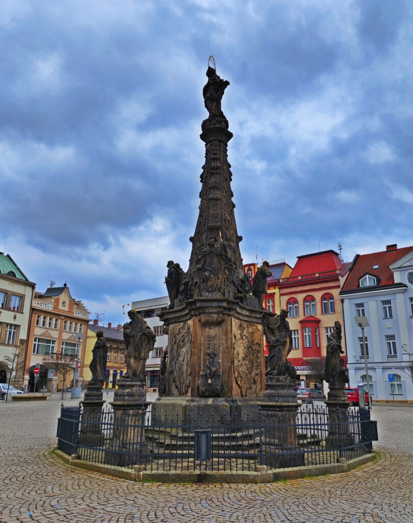 Uprostřed náměstí se tyčí bohatě zdobené rokokové Mariánské sousoší. Panna Maria stojí na zeměkouli obtočené hadem – symbolem hříchu – a kolem ní stojí šest světců, jako němí svědkové víry a naděje.