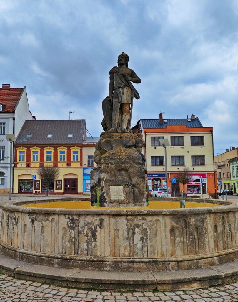 A nakonec – kašna se sochou Záboje, hrdiny z Rukopisu královédvorského. V staroslovanském kroji, s mečem a štítem v rukou, střeží tři životadárné prameny: čistotu, zdraví a stálost. Socha, která byla kdysi odstraněna, se dnes pyšně vrátila na své místo, a její vytesaná slova jsou moudrým poselstvím pro každého, kdo kolem projde: „Ty mluvi k nim slovy oteckými.“ Připomínají nám, že náš jazyk je poklad, o který je třeba pečovat – stejně jako o celé toto kouzelné náměstí.