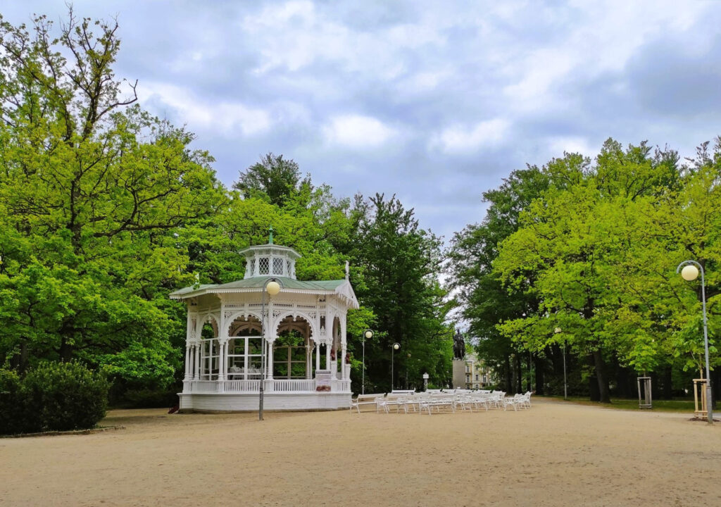 Procházku začněte v Městských sadech, kde se tyčí jezdecká socha císaře Františka I., zakladatele lázní. Právě tady, v nejstarší upravené části města, stojí hudební pavilon, kde dnes hrává Františkolázeňský symfonický orchestr.