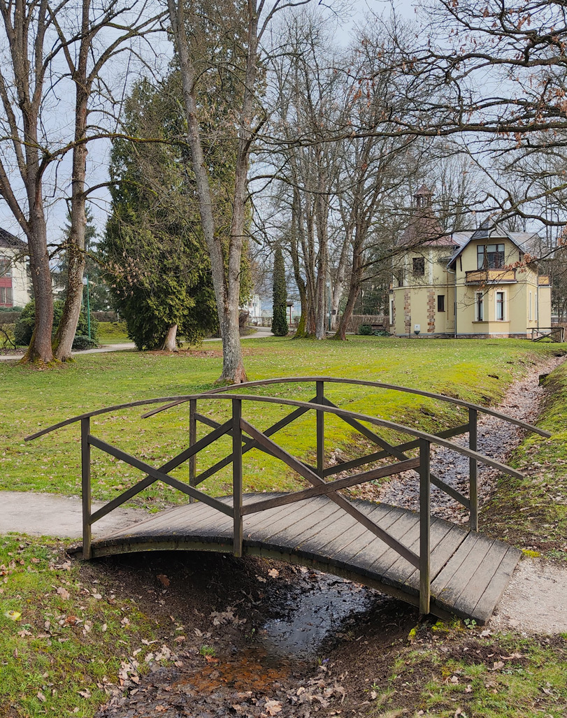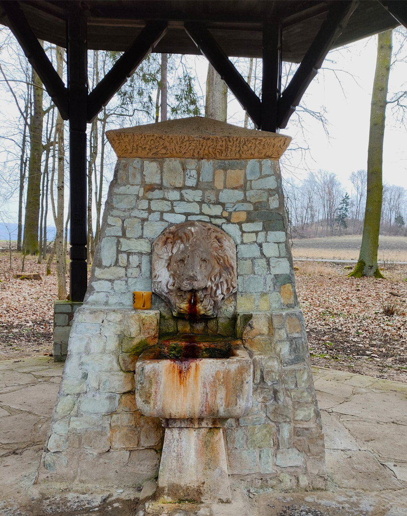 Pramen najdete v půvabném dřevěném altánku s jehlancovou střechou, ozdobeným zlatým klíčem – symbolem lázní. Voda vytéká z kamenného podstavce přímo z tlamy lva, což dodává místu noblesní atmosféru.