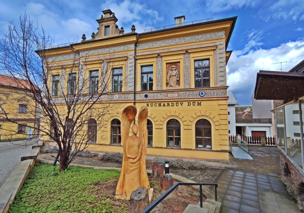 Hned přes ulici vás okouzlí novorenesanční Suchardův dům. Ovšem není to jen krásná fasáda, co stojí za pozornost. Tento dům je živoucí galerií umění a vtipu. Členové slavného sochařského rodu Suchardů jej vyzdobili nejen sochami, ale i moudrými a hravými nápisy. Nejslavnější z rodu, Stanislav Sucharda, je autorem pomníku Františka Palackého v Praze. Jeho bratr Vojtěch vytvořil apoštoly pro Staroměstský orloj a ozdobil svatovítskou katedrálu. A jejich sestra Anna byla matkou slavného ilustrátora Cyrila Boudy.