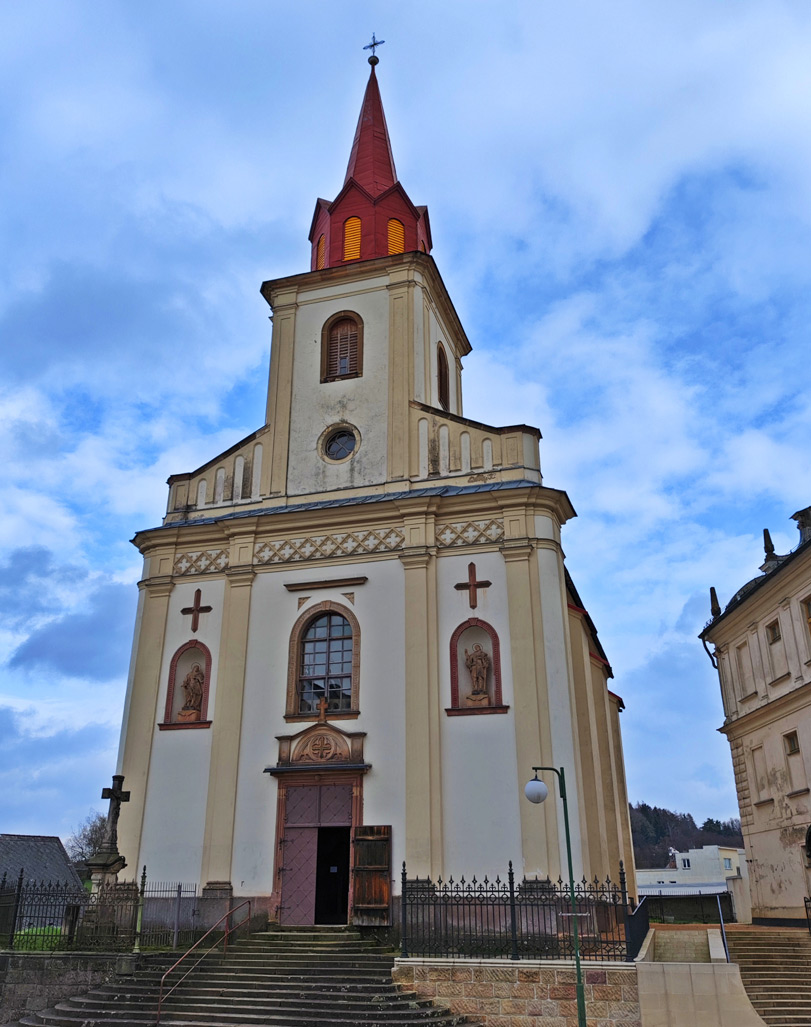Tento farní kostel zažil požáry, zkázu i obnovu.  Původní dřevěný kostel vzplál tak prudce, že se roztavily i zvony. Na jeho místě vyrostl nový svatostánek, ale ani ten neunikl osudu – byl zbořen a nahrazen barokní perlou od stavitele Antona Teimera.