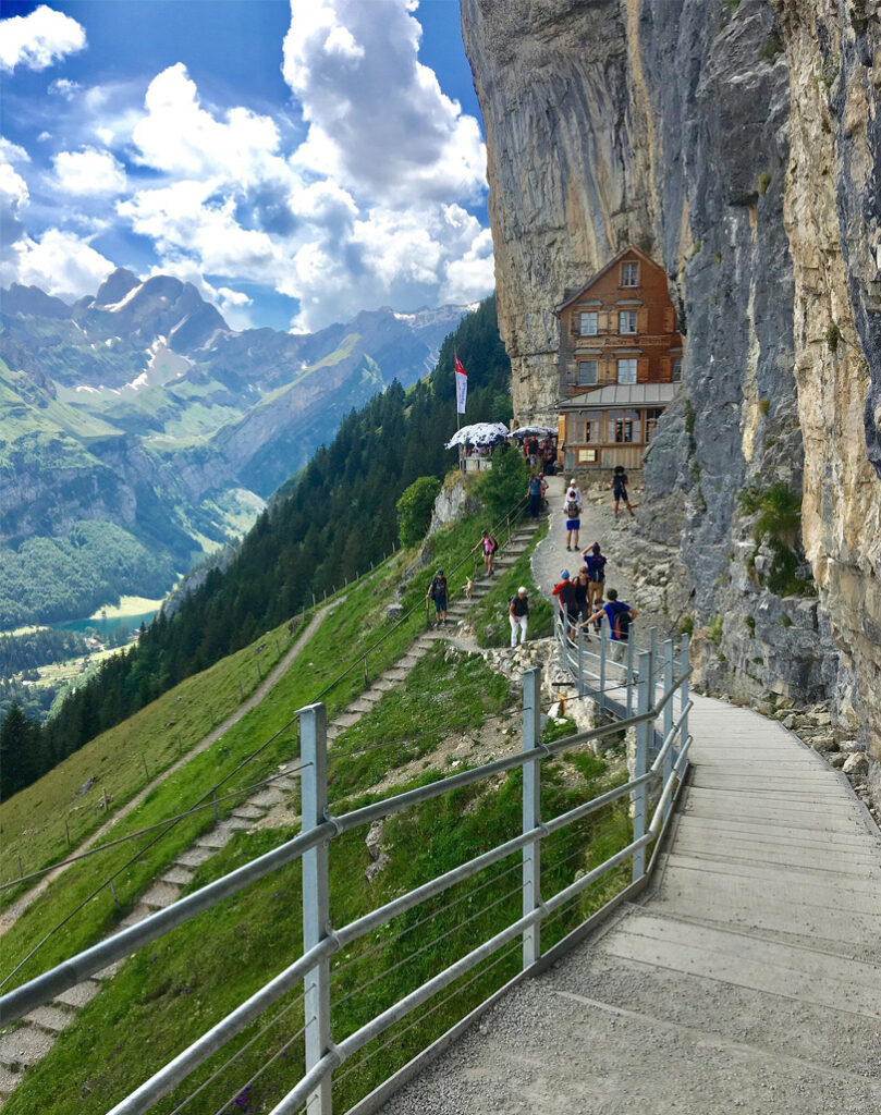 Následně jsme se vydali do proslulé horské restaurace na hoře Ebenalp. Horská chata Berggasthaus Aescher je doslova zaklíněná do skály a je místem, které musíte zažít na vlastní kůži.