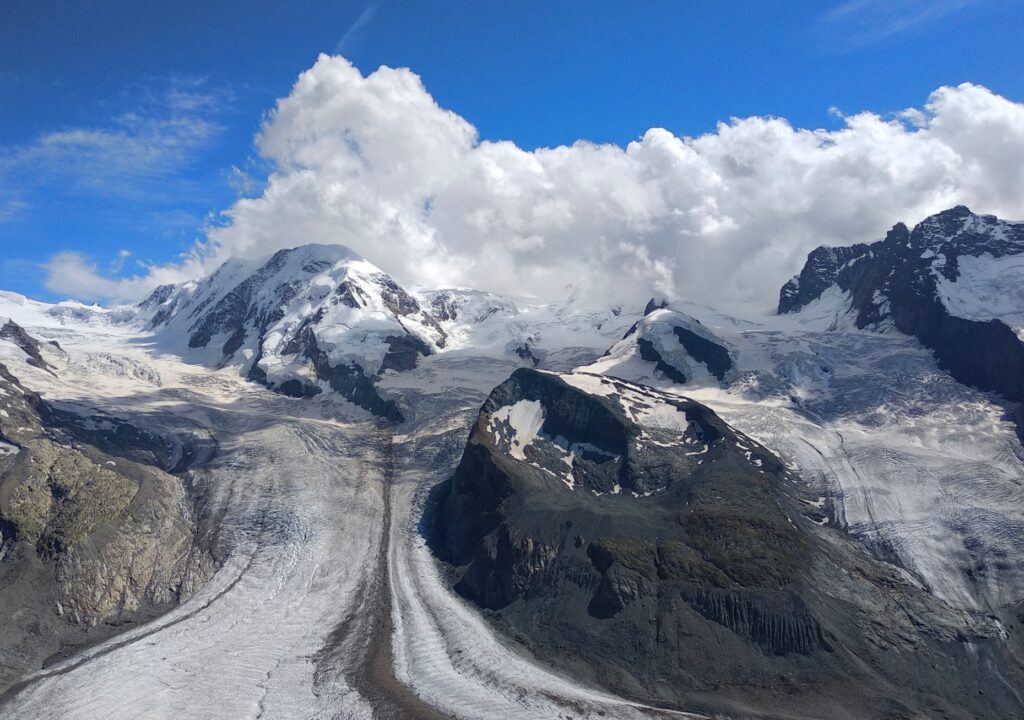 Na vrcholu jsme pak měli legendární horu Matterhorn na dosah ruky. Jeho ostré hrany a dokonalý tvar byly úchvatné. Celkové panoráma bylo dechberoucí. V pozadí se jako bílé moře rovněž rozprostíral ledovec Gorner obklopený dalšími zasněženými vrcholy.